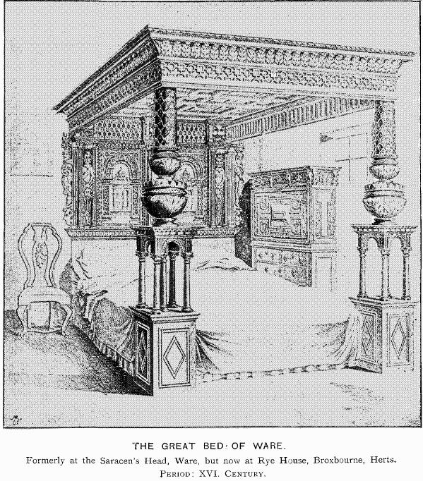 In the town of Ware (Herts)there once was a carpenter named Jonas Fosbrook who made a bed fit for a king. It is massive four poster constructed from oak and measuring 3.38m long and 3.28m wide. It was said that Fosbrook intended the bed to be used for Edward IV although there is no evidence of this ever happening. The bed was owned by several of Wares inns; it was alleged that once in the 17th century twelve married couples slept in it. However, it is said that the ghost of Fosbrook will pinch and scratch anyone who slept in it because the bed was not being used for royalty. The Great Bed is now housed in the Victoria and Albert Museum in London.